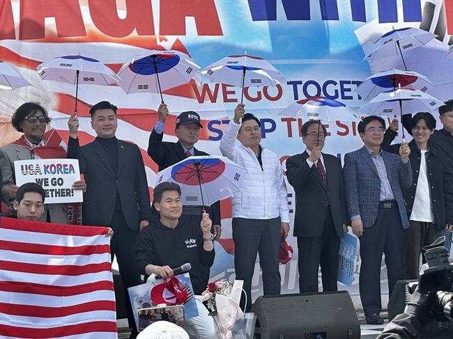 [현장] “하늘의 백장미, 지상에 내려앉다”… 전한길, 캠프 험프리스 앞 ‘우산혁명’ 개최