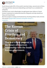 깅리치 전 의장은 “한국은 전 세계 상선의 35%를 건조하고 중국에 이어 2위를 차지하고 있다”며 “나는 오래 전부터 한국의 첨단 조선 기술이 낙후된 미국 조선소를 개혁하는 데 도움을 줄 수 있다고 말해왔다”고 썼다.