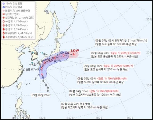 기상청이 4일 오전 4시 30분 발표한 제15호 태풍 페이파 예상 경로. [기상청 제공. 재판매 및 DB 금지]