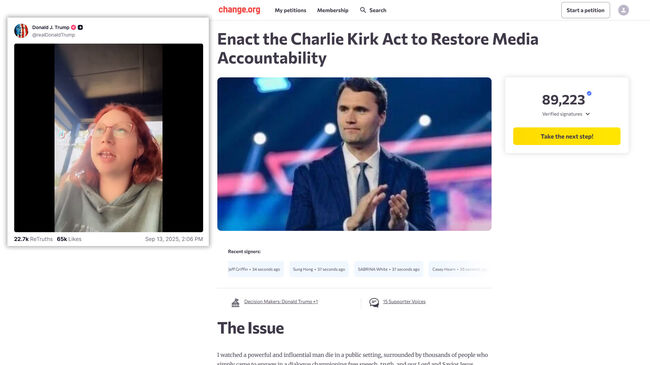 체인지닷컴에 등록된 글에 따르면, "그(찰리 커크)의 생명은 자신의 잘못이 아니라 주류 언론이 퍼뜨린 근거 없는 주장 때문에 희생됐다"며 "이러한 주장에는 실질적인 증거가 없었으며, 이는 잘못된 정보다 생명을 얼마나 위험에 빠뜨릴 수 있는지를 극명하게 보여준다"고 주장한다.
