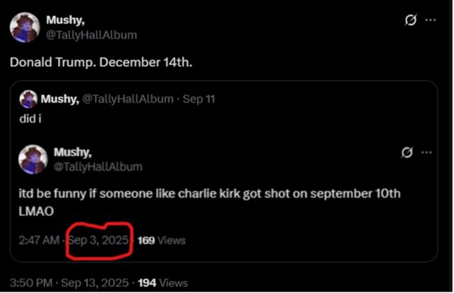 9월 3일 새벽, 머시(Mushy)라는 엑스(X) 계정은 “찰리 커크 같은 놈이 9월 10일에 총에 맞으면 웃기겠다 LMAO”라고 게시했다.