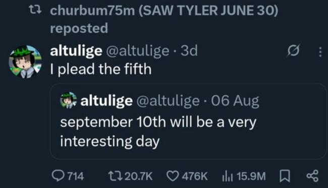 또 다른 계정 알툴리제(altulige)는 8월 6일 “9월 10일은 매우 흥미로운 날이 될 것”이라고 게시했다. 커크 암살 후 이 계정은 “나는 묵비권을 행사하겠다”고 썼다.
