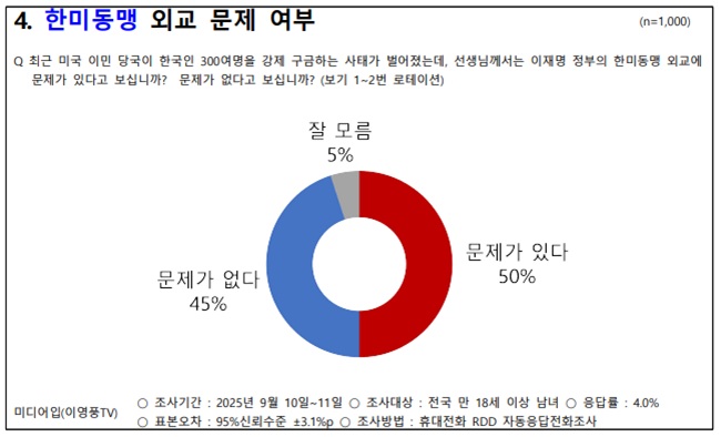 국민의 50%가 이재명 정부의 한미동맹 외교는 문제가 있다고 답했다. 미디어입(이영풍TV) 자료 캡처.