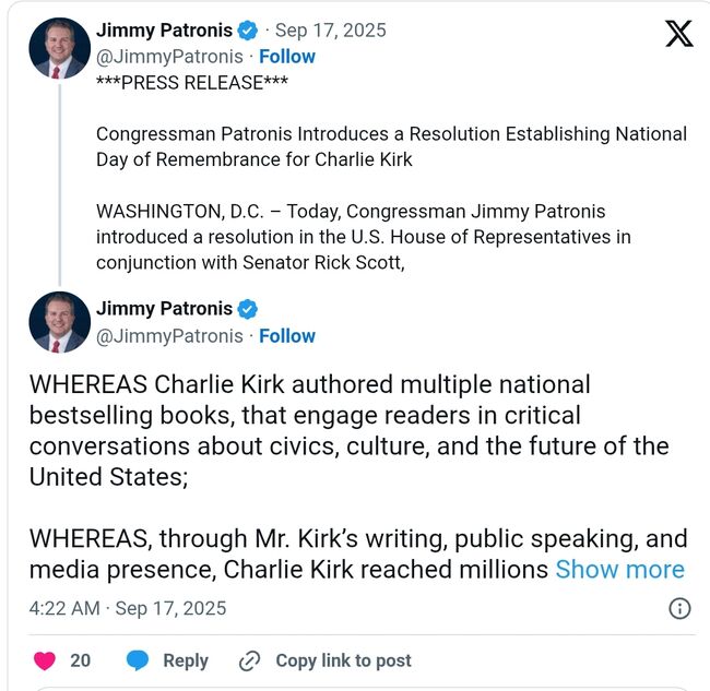 그는 "10월 14일, 즉 그의 32번째 생일이 될 날을 찰리 커크를 위한 국가 추모의 날로 지정해, 미국의 애국자로서 찰리의 유산을 기리는 결의안을 주도하게 돼 자랑스럽다. 함께 모여 기도하고 찰리가 국가에 미친 영향을 기념하는 날이다."라고 덧붙였다.