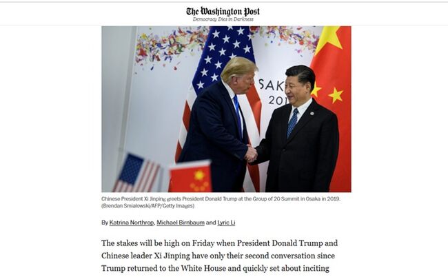 영국 방문을 마치고 귀국한 도널드 트럼프 미국 대통령이 19일(현지시간) 오전 시진핑 중국 국가주석과 3개월여 만에 전화 통화를 했다고 외신들이 일제히 보도했다. / WP 온라인 캡처. 도널드 트럼프 미국 대통령과 시진핑 중국 국가주석이 3개월여 만에 전화 통화하면서 다음달 경주에서 열리는 제32차 아시아·태평양 경제협력체(APEC) 정상회의에서 만나기로 합의했다고 외신들이 긴급 타전했다.