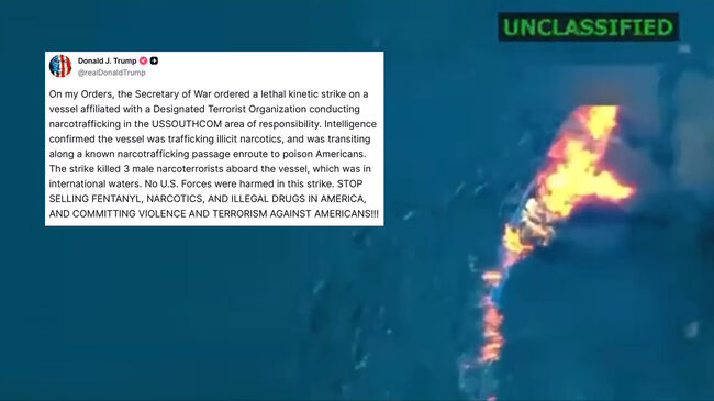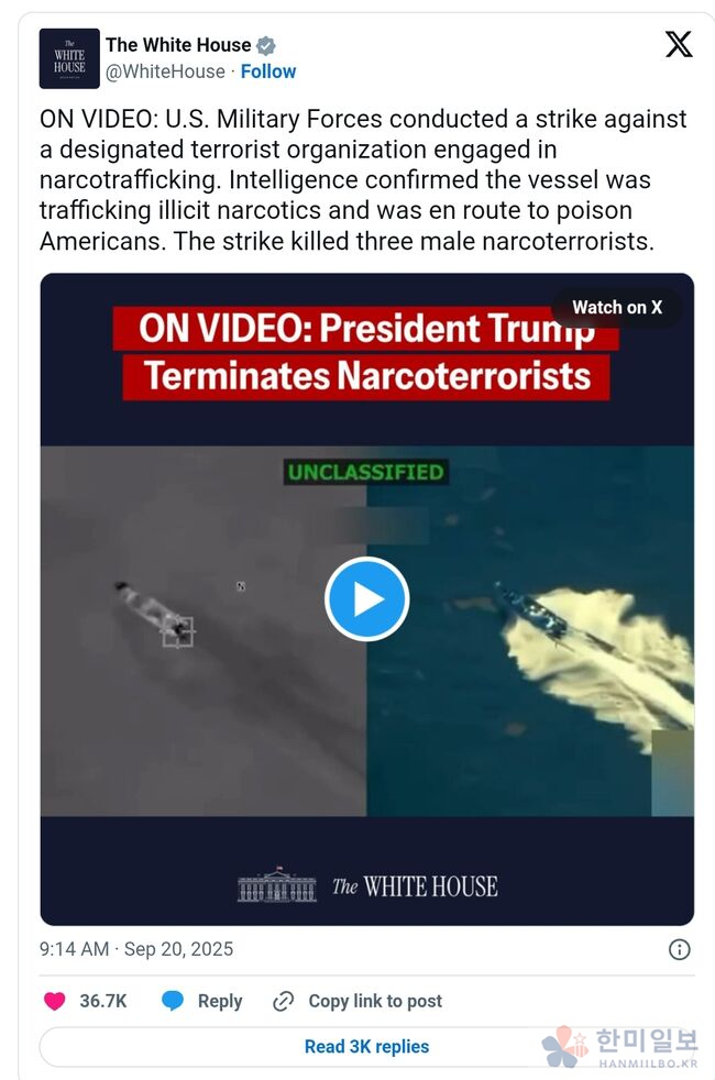 도널드 트럼프 대통령도 트루스소셜에 영상을 공유하면서 "내 명령에 따라, 전쟁부 장관은 남부사령부 관할 구역에서 마략 밀매를 자행하는 지정된 테러조직 소속 선박에 치명적인 물리적 공격을 명령했다"고 밝혔다.