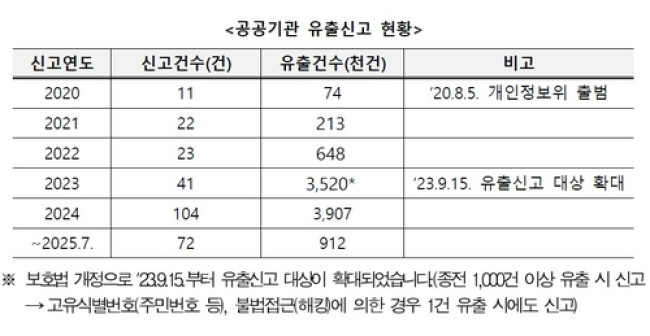 올해 들어서도 7월까지 이미 72건의 신고가 들어왔고 총 91만건의 개인정보가 유출된 것으로 파악됐다.