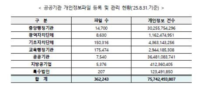 공공기관이 보유한 개인정보는 중앙행정기관 303억건, 광역지자체 12억건, 기초지자체 44억건, 교육행정기관 29억건 등 총 757억건에 달한다.