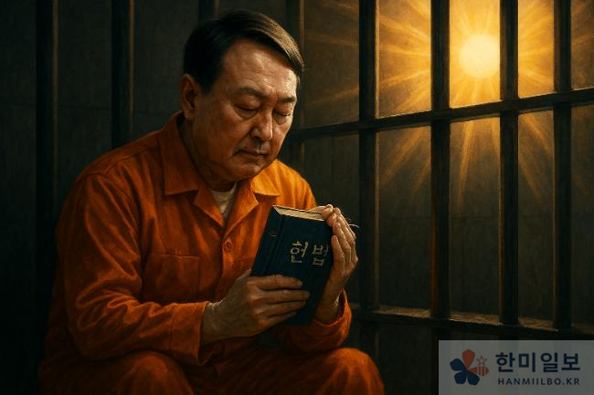 옥중에서 ‘헌법’을 움켜쥔 채 기도하는 윤석열 전 대통령. 헌재 심판 청구는 단순한 법리 싸움을 넘어 정국의 뇌관으로 떠올랐다. 한미일보 그래픽