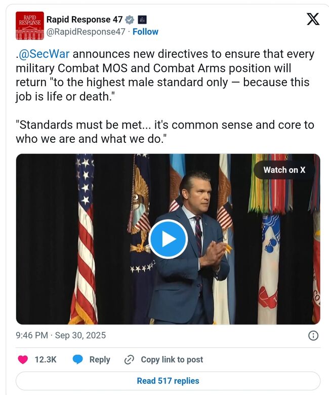 국방부 장관은 전투 직책에 대한 "최고 남성 기준"으로의 복귀를 포함하여 신체적 건강 및 단장 요건에 관한 10개의 새로운 국방부 지침을 발송한다고 밝혔다.