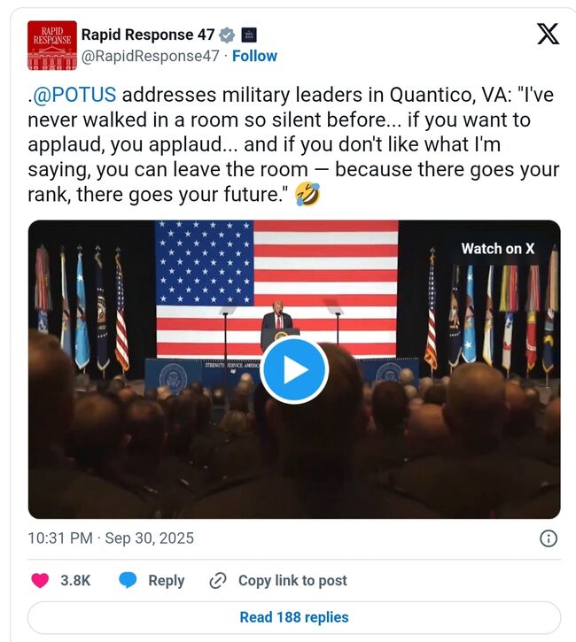 피트 헤그세스 미국 전쟁부(옛 국방부) 장관은 30일(화) 열린 대변 회의에서 미군 장성 수백 명을 대상으로 "정치적 올바름"(political correctness, PC) 리더십의 시대는 끝났으며, 그의 접근 방식에 동의하지 않는 사람은 사임해야 한다고 말했다.