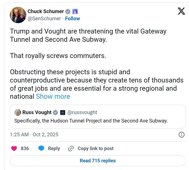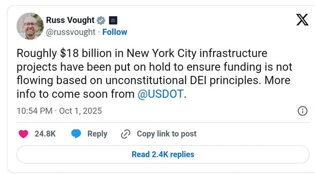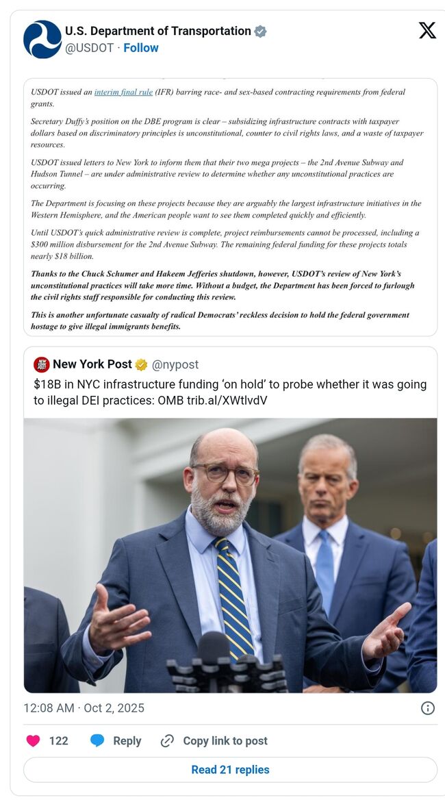 트럼프 행정부는 정부 폐쇄 속에서 민주당이 우세한 주들을 타깃으로 뉴욕시의 180억 달러 규모의 교통 프로젝트를 일시 중단하고 80억 달러 규모의 친환경 에너지 프로젝트를 취소했다.