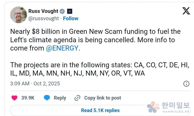 러셀 보트(Russell Vought) 예산관리국장은 1일(수) 엑스에 "좌파의 기후 의제를 부추기기 위한 그린 뉴 스캠(Green New Scam) 자금 지원이 거의 80억 달러에 달하는 것이 취소된다"고 밝혔다.