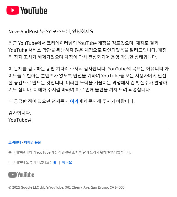 뉴스앤포스트는 9월 18일 채널 복원을 위한 어필을 진행했습니다. 당초 2일이면 검토될 것이라는 안내문과 달리, 유튜브측은 10월 5일이 되어서 계정을 복원해주었고 안내 이메일을 보내왔습니다.
