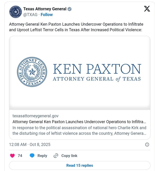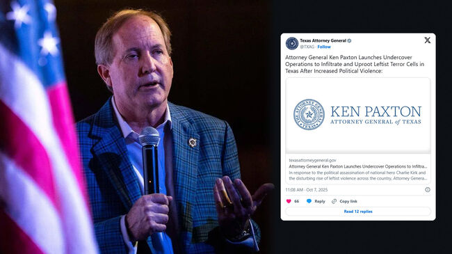 켄 팩스턴(Ken Paxton) 텍사스주 법무장관은 7일(화) "국가적 영웅 찰리 커크의 정치적 암살과 전국적으로 좌익 폭력이 급증하는 상황에 대응해" 텍사스 주에서 활동하는 "좌익 정치적 폭력과 연관된 다양한 단체에 대한 비밀 수사에 착수했다"고 발표했다.