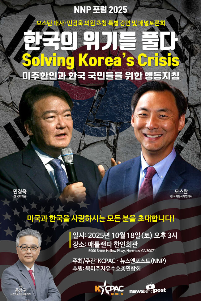한미일보와 콘텐츠 교류 특약(MOU)을 맺고 있는 미국 뉴스앤포스트(NNP)는 회사공고(社告)를 통해 오는 18일 오후 3시(미국 현지시간·한국 시간은 19일 오전 4시) 조지아주 애틀랜타 한인회관에서 모스탄 전 국제형사사법대사와 민경욱 전 국회의원이 특별 강연에 나선다고 12일 밝혔다.