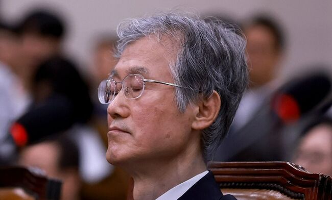 조희대 대법원장이 13일 국회에서 열린 법제사법위원회 국정감사에 출석해 여야 의원들의 설전을 지켜보다 눈을 감고 있다. 연합뉴스.