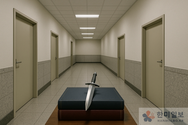 세 개의 닫힌 문이 마주한 복도 끝, 헌법과 형법 위에 놓인 차가운 칼날. 법은 열리지 않은 문 속에서 스스로의 정의를 묻고 있다. 한미일보 그래픽