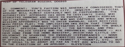 미 국무부가 기밀 해제한 ‘외교 전문(80SEOUL 006865)’에 따르면 1980년 당시 윌리엄 글라이스틴 주한미국대사는 “(간첩 이창룡 생포 등) 이 모든 일의 배후에 ‘불순세력’과 공산주의 선동가들이 있다(‘impure elements’ and communist instigators lay behind the whole affair)”고 워싱턴에 보고했다. 미국의 외교 전문도 ‘외부 침입자들(infiltrators·남파간첩들)’과 ‘공산주의 선동가들(communist instigators·고정간첩들 또는 혁명역량)’이라고 복수로 못 박아 명시하고 있다.