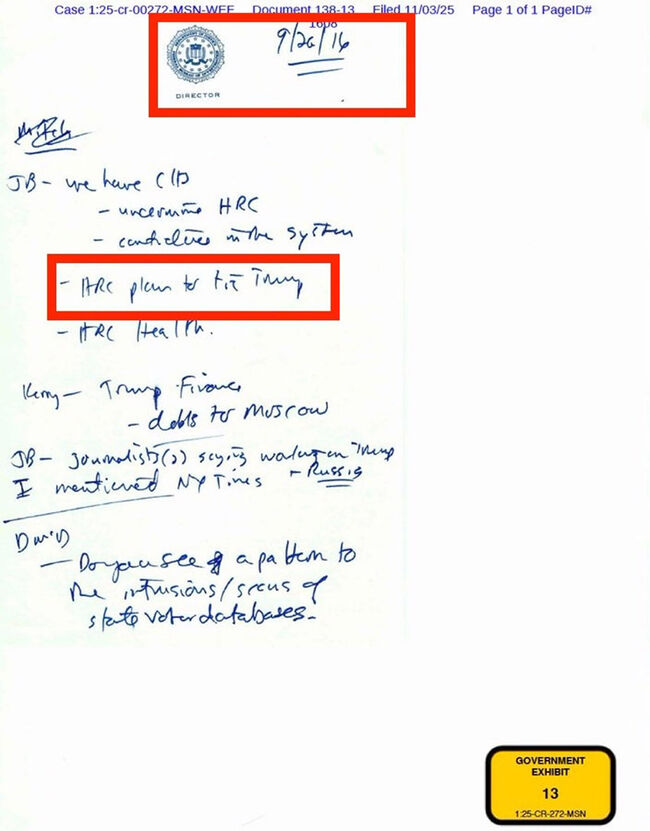 법무부가 제출한 증거 중 2016년 9월26일자 손글씨 메모에는 'HRC plan to tie Trump'(HRC, 트럼프와 연계 계획)이라고 씌여 있다. HRC는 힐러리 로댐 클린턴을 가르킨다. 베니 존슨 엑스 계정 발췌.