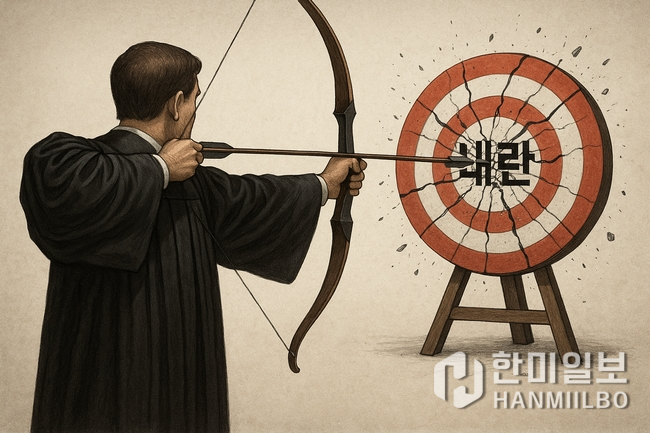 내란의 과녁을 겨눈 법원. 정치적 수사를 향한 첫 경고가 발사됐다. 한미일보 그래픽