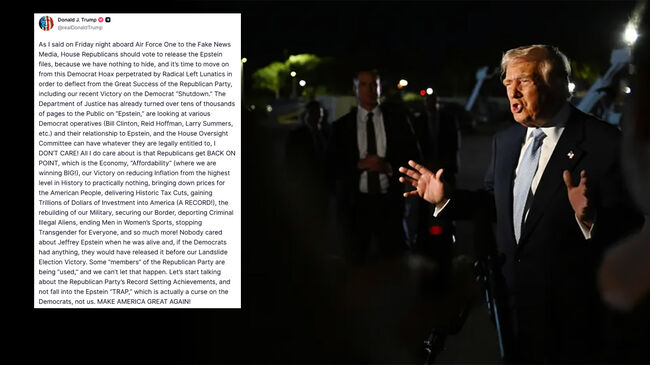 그는 자신의 게시물에서 "금요일 밤 에어포스 원에서 가짜 뉴스 매체에 말했듯이, 하원 공화당원들은 엡스틴 파일을 공개하는 데 투표해야 한다. 왜냐하면 우리는 숨길 것이 없고, 공화당의 엄청난 성공, 특히 민주당의 '셧다운'에서의 승리를 핑계로 삼으려는 급진 좌파 광신자들이 저지른 이 민주당 사기극에서 벗어나야 할 때이기 때문이다."라고 말했다.