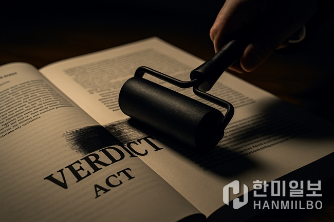 법을 다시 쓰고, 판결을 지우는 가려진 손. 하지만 국민은 알고 있다. [그래픽=한미일보]
