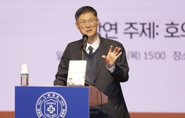 문형배 전 헌법재판소장 권한대행이 20일 경남 인제대에서 강연하고 있다. 연합뉴스