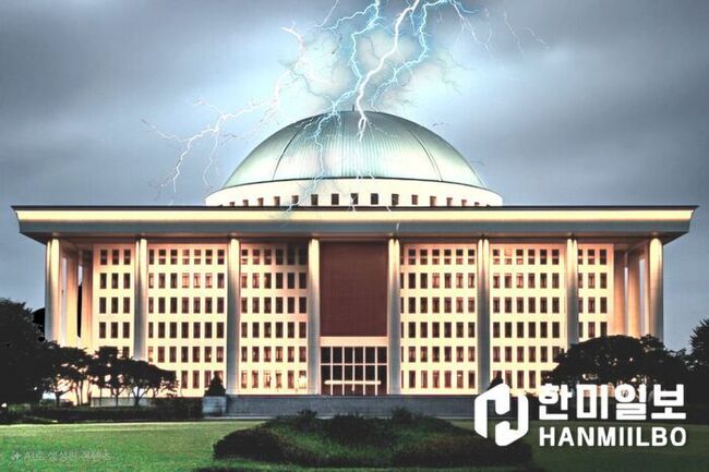 둘로 쪼개진 민의의 전당인 국회의사당. 쪼개진 건 의사당이 아니라 국민이다. [그래픽=한미일보]