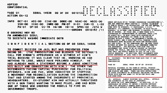 미국 정부가 5·18 발발 44년 만인 지난해 10월4일(현지시간) 기밀 해제한 외교 전문(80SEOUL 014538)에 따르면 정동년(2022년 작고) 전 5·18기념재단 이사장이 재판정에 서기 전에 김대중과의 연계와 유죄를 자백하는 진술을 했다. 기밀 문건에는 “정씨가 봉기의 주동자이자 김대중과 밀접하게 활동하며 ‘폭력을 통해 정부를 전복하려 했다(overthrow the government by violence)’”고 진술했으며, 김대중에게 푹 빠진(infatuated) 사람으로 알려진 정씨는 학생들에게 내란을 일으키도록 돈을 줬고 정씨는 이 돈이 김대중으로부터 왔다고 말했다(he was allegedly so infatuated with KIM DAE JUNG that he gave money to students for insurrection from his own pocket, saying it came from Kim)고 미 대사관은 보고문을 띄웠다. 또한 정씨가 김대중이 권력을 쥐게 되면 ‘국회의원 자리 하나(a National Assembly seat)’를 보상받기를 바랐는지도 모른다고 군검찰이 브리핑한 사실도 보고서에 기술했다. 5·18의 진실은 여전히 은폐돼 있다는 여론이 45년이 지나도록 만만치 않은 실정이다. / 사진=미 국무부 기밀해제 문서 캡처. 한미일보가 편집 과정에서 삽입.