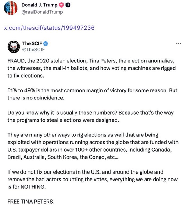 트럼프 대통령이 지난 1일(현지시간) 공유한 @TheSCIF 게시물에는 “2020년 미국 대통령 선거가 도난당한 선거였으며 투표기와 우편 투표용지에 문제가 있었다”고 언급됐다.