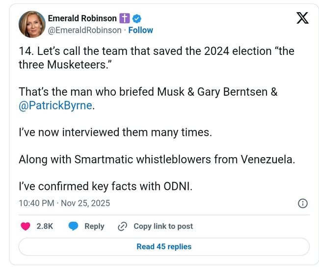 이에 관해서는 뉴스맥스와 원어메리카뉴스(OANN)에서 백악관 특파원을 지낸 에머럴드 로빈슨(Emerald Robinson) 기자가 상세하게 밝힌 바 있다. 로빈슨은 최근 일련의 X 게시글을 통해 삼총사(패트릭 번, 개리 번슨, 일론 머스크)가 작년 선거를 구했다고 밝혔다.