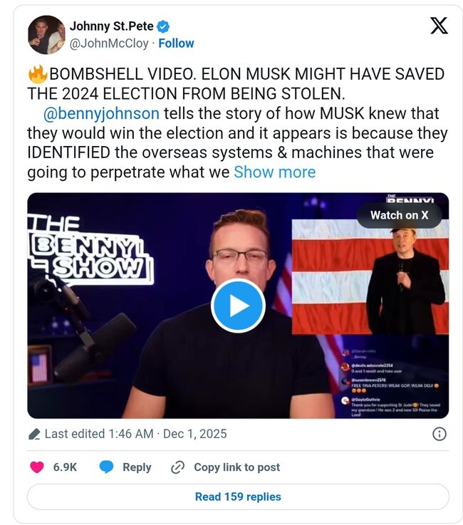 이 글에는 또 베니 존슨이 진행하는 '더 베니 쇼'(The Benny Show) 팟캐스트 영상이 첨부돼 있다. 존슨은 영상에서 머스크가 2020년의 부정선거를 통해 해외 시스템과 기계들을 파악하고, 2024년에 그에 대처했다고 설명했다.