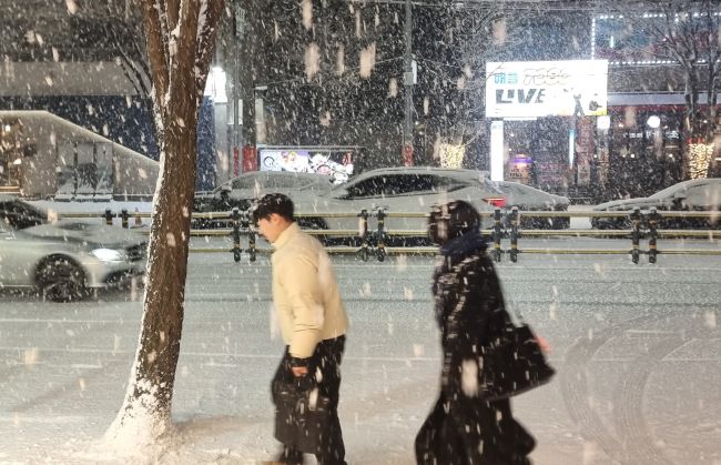 4일 내린 눈으로 서울 도심이 크리스마스 카드로 변했다. 갑작스러운 폭설에 행인은 발걸음을 재촉하고 아이들은 어둠 속에서 눈사람을 만들며 즐거워하고 있다. 임요희 기자Ⓒ한미일보
