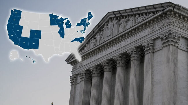 연방대법원 건물 전경과 출생시민권 행정명령에 반발해 연방정부에 소송을 제기한 주들이 표시된 지도.