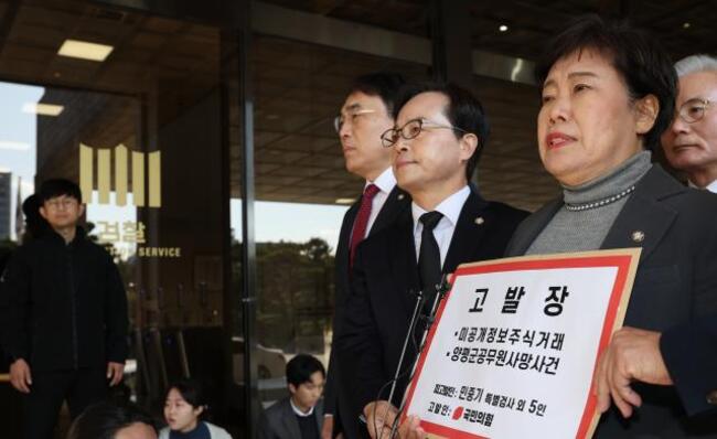 조배숙 국민의힘 사법정의수호 및 독재저지 특별위원회 위원장과 숨진 채 발견된 경기 양평군청 소속 공무원의 변호인이 22일 서울 서초구 서울중앙지검에서 민중기 특별검사에 대해 자본시장법위반, 직권남용 등의 혐의로 고발에 앞서 발언하고 있다. 연합뉴스