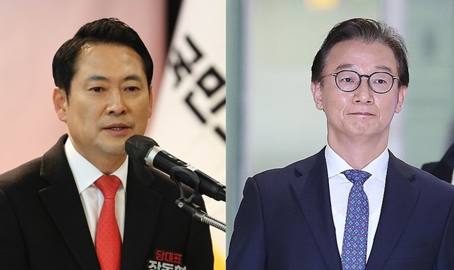 장동혁(왼쪽) 국민의힘 대표가 민주당의 현금 및 명품 시계 수수 의혹과 관련해 여당에 대한 수사를 촉구하고 있다. 오른쪽은 금품 수수 논란이 일고 있는 전재수 해양수산부 장관. 연합뉴스