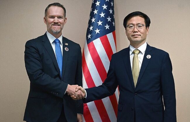 여한구 산업부 통상교섭본부장(오른쪽)과 제이미슨 그리어 미국무역대표. [사진=산업통상자원부] 미국 무역대표부(USTR)는 미국 워싱턴 D.C.에서 18일 비공개로 열릴 예정이었던 한미 자유무역협정(FTA) 공동위원회 회의를 취소했다.