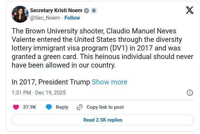 크리스티 노엠 국토안보부 장관은 18일 오후 늦게 엑스(X)에 게시한 글에서 "브라운 대학교 총격범 클라우디오 마누엘 네베스 발렌테(Claudio Manuel Neves Valente)는 2017년 다양성 추첨 이민 비자 프로그램(DV1:diversity lottery immigrant visa program)을 통해 미국에 입국해 영주권을 취득했다. 이 흉악한 인물은 결코 우리 나라에 들어오지 못했어야 했다"고 밝혔다.