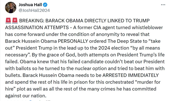 또 게시물은 “오바마는 즉시 체포되어 이 조직적인 ‘청부 살인’ 계획과 그가 국가에 저지른 수많은 범죄에 대해 종신형을 선고받아야 한다”고 주장하고 있다.