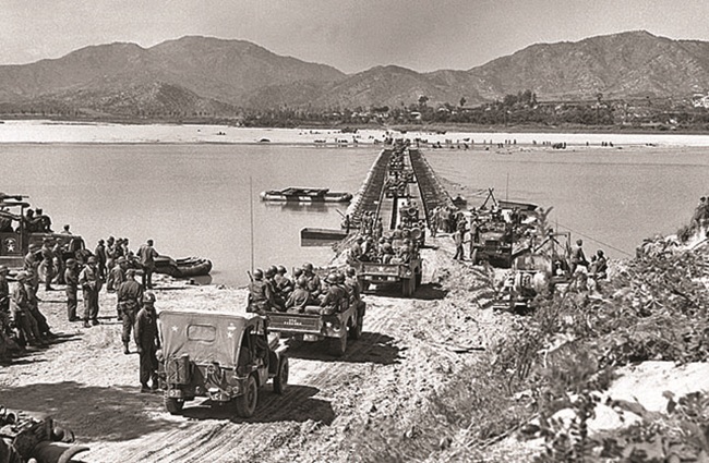 6·25전쟁 최대 위기로 꼽히는 낙동강전투에서 미 24사단 병력이 부교를 타고 낙동강을 도하하고 있다. [사진=퍼블릭도메인]
