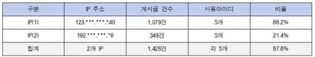 • 전체 87.6% 단 2개의 IP에서 작성… 한동훈 가족 명의와 동일