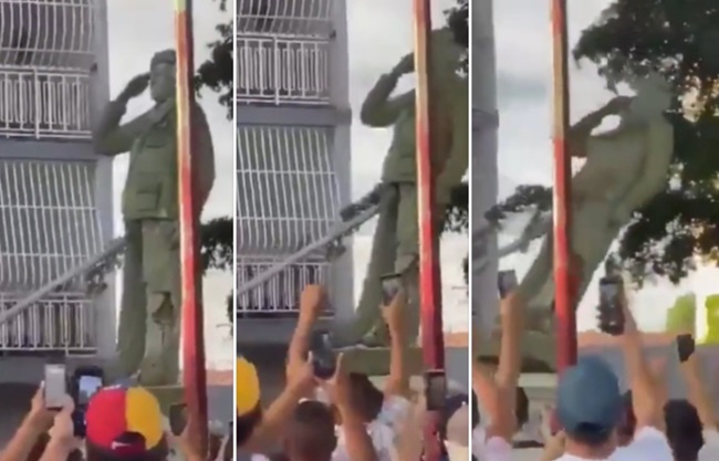 도널드 트럼프 대통령이 3일 새벽, 베네수엘라에 대한 ‘대규모 공격’으로 니콜라스 마두로를 체포한 후 처음 맞는 아침, 베네수엘라 시민들이 광장에 세워진 마두로의 동상을 끌어내리고 있다. 소련 붕괴 후 러시아와 동유럽 국가 국민들이 레닌 동상을 끌어내렸듯 ‘마두로’도 철거되는 중이다. [사진=유튜브 캡처]