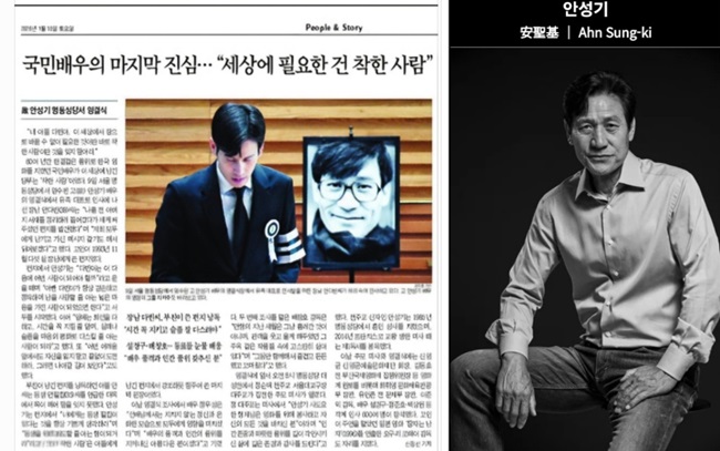 조선일보 2026년 1월10일자 기사(왼쪽). 5일 타계한 배우 안성기. [사진=조선일보·아티스트컴퍼니]