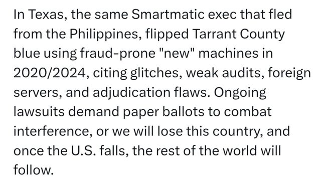 또한 “텍사스에서는 필리핀에서 도피한 동일한 스마트매틱 임원이 2020년과 2024년에 조작에 취약한 ‘신형’ 기계를 이용해 태런트 카운티를 민주당 텃밭으로 뒤집었는데, 이는 시스템 오류, 허술한 감사, 해외 서버, 투표지 심사 결함을 악용한 조작이었다”고 전했다.