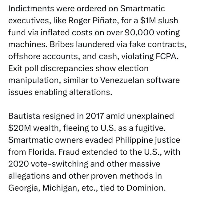 게시물은 “로저 피냐테(Roger Piñate)를 비롯한 스마트매틱 임원들은 9만 대 이상의 투표기 가격을 부풀려 100만 달러(약 14억 원)의 비자금을 조성한 혐의로 기소되었다”며 “이들은 허위 계약, 역외 계좌, 현금을 통해 뇌물을 세탁했다”고 밝혔다.
