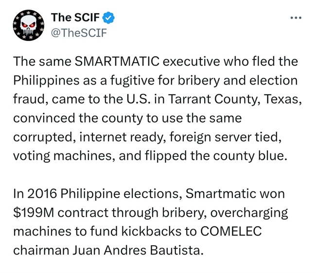 정치 이슈를 주요 콘셉트로 다루는 ‘@TheSCIF’는 “필리핀에서 뇌물수수와 선거 부정 혐의로 도피 중인 스마트매틱의 한 임원이 텍사스주 태런트(Tarrant) 카운티가 인터넷으로 해외 서버에 연동된 ‘조작된 투표기’를 사용하도록 설득해 해당 카운티를 민주당 지지 지역으로 만들었다”고 11일 소셜미디어 X를 통해 밝혔다.