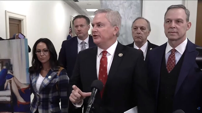 하원 감독위원회 공화당 의원들이 빌 클린턴 전 대통령이 의회 증언에 불참한 후 기자들에게 발언하고 있다. 좌로부터 로렌 보버트(콜로라도), 마이클 클라우드(텍사스), 제임스 코머 위원장(켄터키), 앤디 빅스(애리조나), 스콧 페리(펜실베이니아) 의원. .