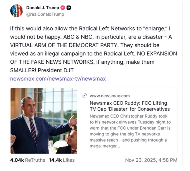 도널드 트럼프 대통령 역시 공개적으로 상한선 해제에 반대 입장을 표명하며 트루스소셜에 "가짜 뉴스 네트워크 확장은 절대 안 된다. 오히려 축소해야 한다!"고 경고했다.