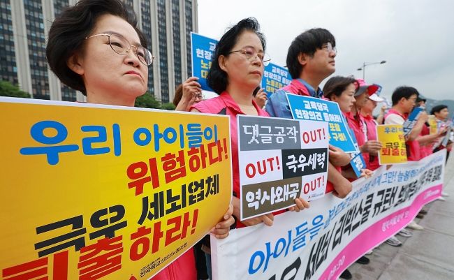지난해 6월10일, 서울 종로구 정부서울청사 앞에서 전국학교비정규직노동조합(학비노조·민노총 산하단체) 조합원들이 ‘리박스쿨’이 서울 일부 초등학교에 늘봄 강사를 공급한 것을 규탄하며 방과후수업 외주 위탁 철폐를 촉구하고 있다. [사진=연합뉴스]